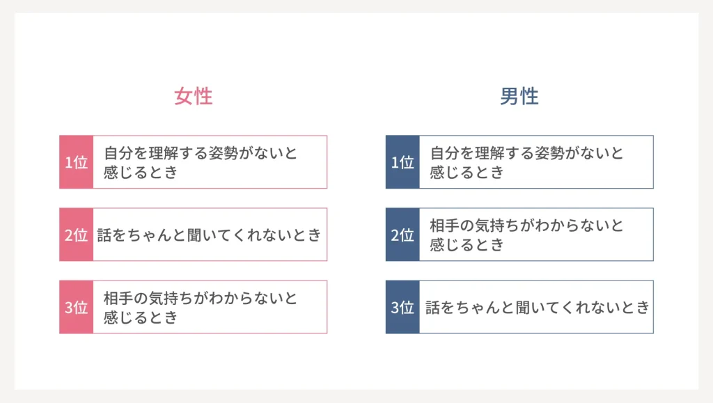 当たり前と思っていることでも、言葉にしないと相手には伝わりません。また、お互いへの関心が薄れ「理解してくれない」と感じるのも大きな要因です。